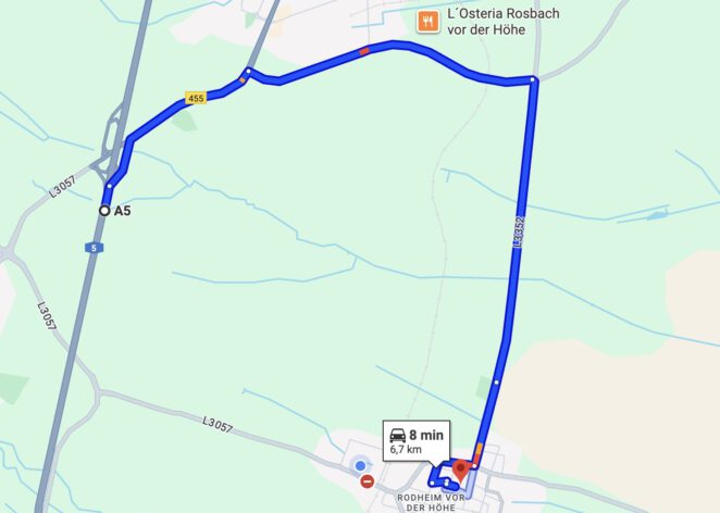 Die Anfahrt zum Bürgerhaus Rodheim ist geändert, da der Bahnübergang gesperrt ist. Wenn ihr von der A5 kommt, bitte über Rosbach fahren (siehe Kartenausschnitt).